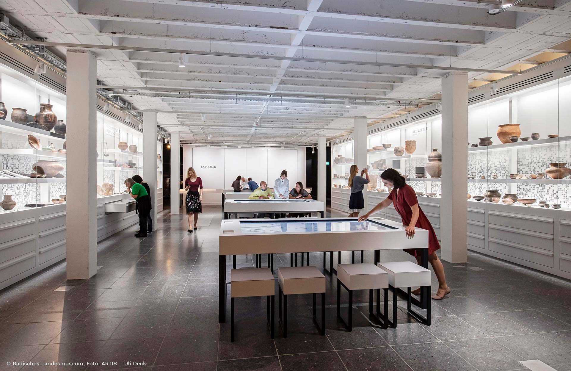 The exhibition Archaeology in Baden at the Baden State Museum Karlsruhe is the first exhibition to follow the museum’s new overall concept: Museum visitors become active users who explore the museum’s collection based on what they are actually interested in using interactive, novel technologies. In the exhibition, the exhibits are initially presented without any further information. The focus is entirely on the aura of the original: A drastic change to the traditional exhibit signs. The visitors can decide themselves whether they want further information and receive it on demand – through the use of a wide variety of technologies. Sometimes almost conventionally via displays mounted above the objects, sometimes using novel, interactive technologies such as AR and VR. Several scientists – called Explainers – are always present to provide further information up close and personal. They even present original objects that visitors can then touch, look at and examine.