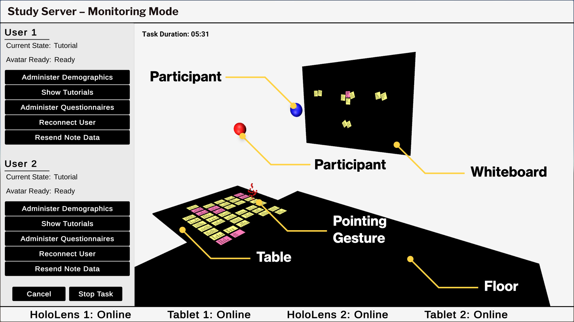 The study conductor can monitor the two participants using the control application. Here, the study conductor sees two participants, who perform Affinity Diagramming. One participant is pointing to a post-it.