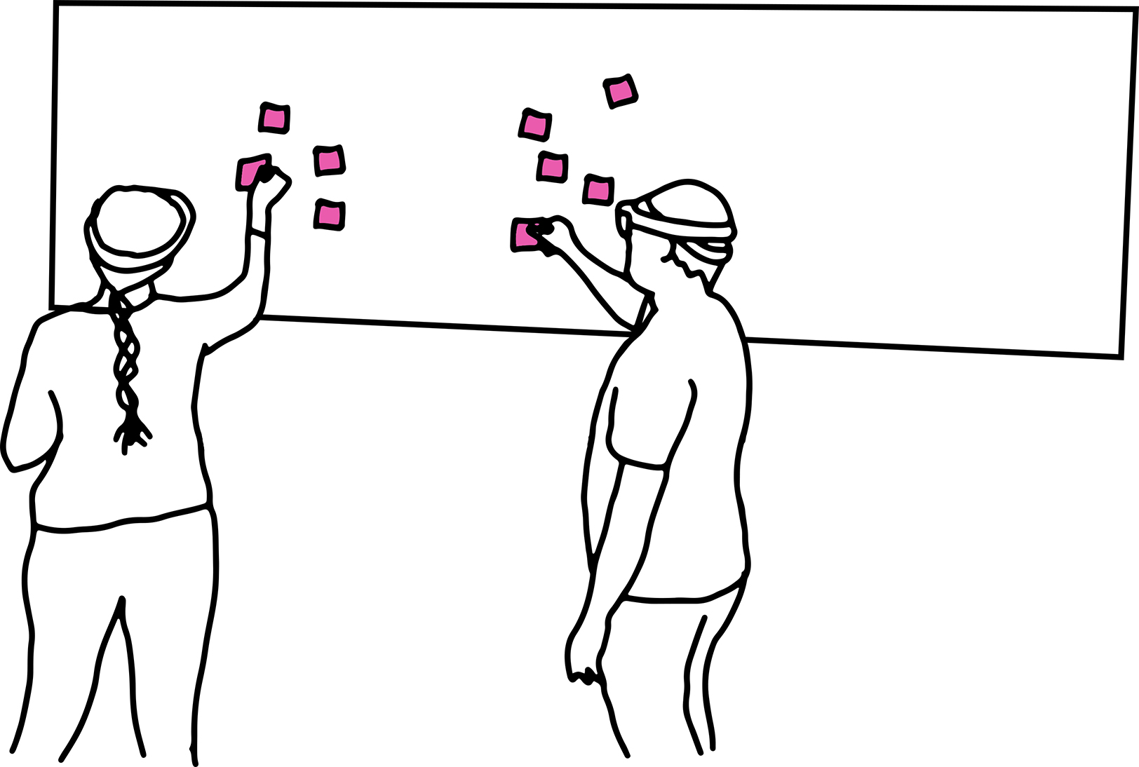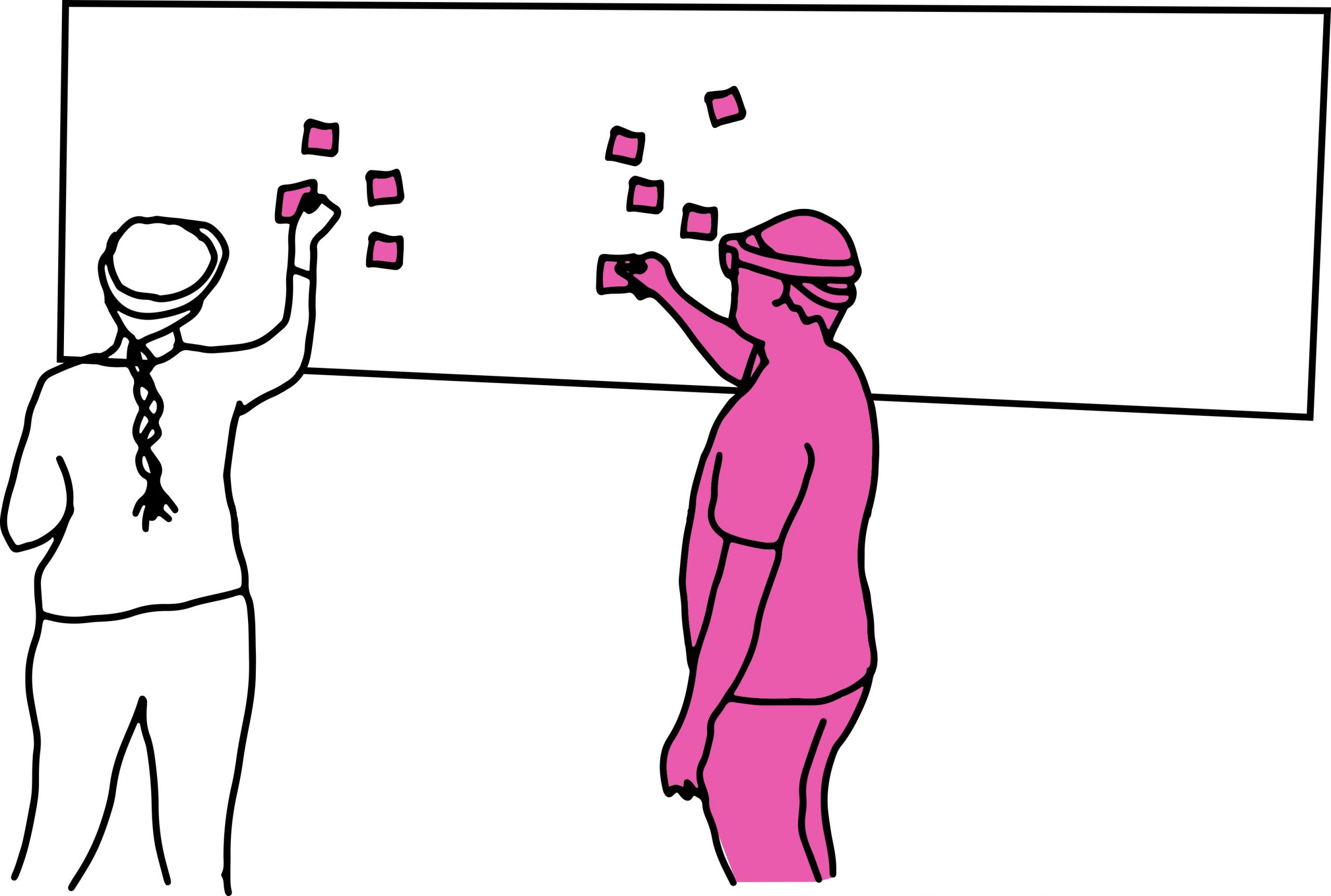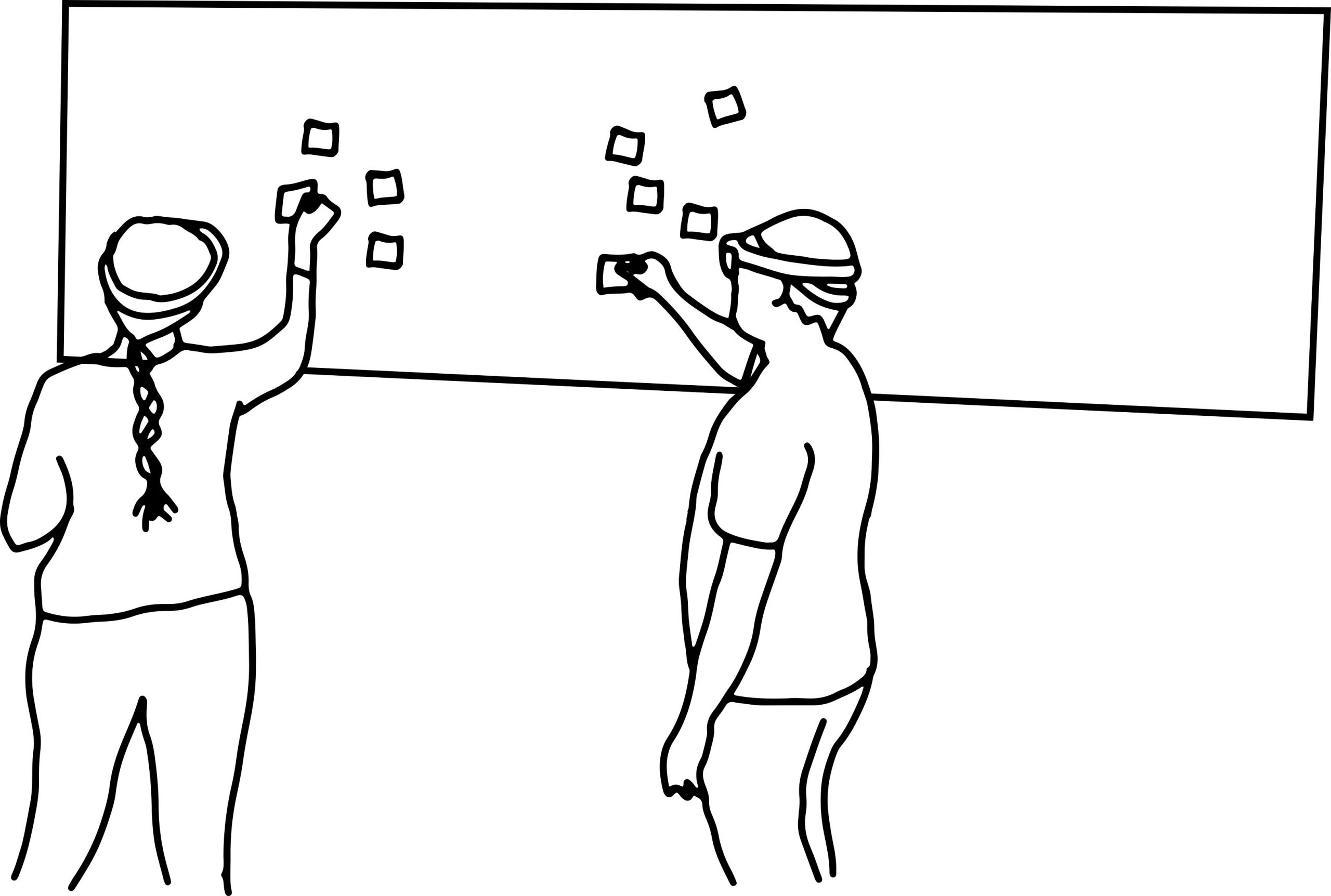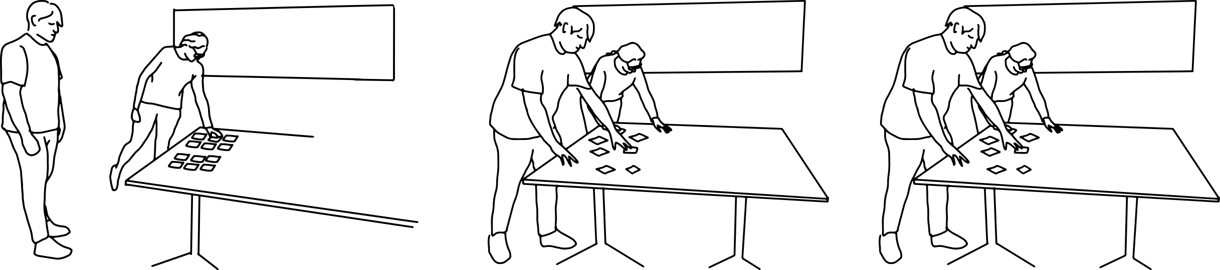 Example sketches describing the study task. Participants started at the table, where they were given prepared sticky notes. Then, they collaboratively clustered them on the whiteboard.