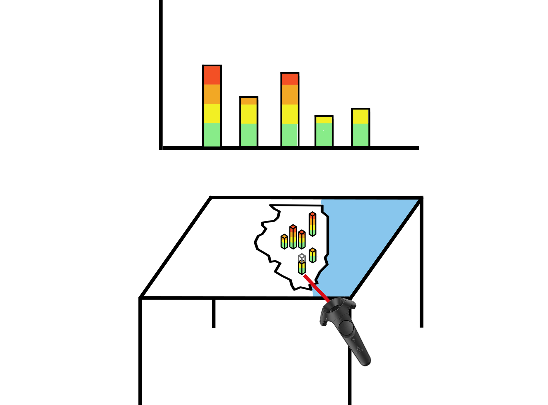 CrimeBlocks was a student project I did with two fellow students in a course on data analysis in mixed reality at the University of Konstanz. It is a VR app with which crime data of the city of Chicago can be visualized and analyzed in VR. By showing the number of crimes as three-dimensional, building-like, blocks on a map of Chicago, the app provides an immersive overview of the data in 3D. Simultaneously, a 2D bar chart, which is always in view of the user allows a more fine-grained comparison between selected data. Consequently, the app follows the Information Seeking Mantra, providing an overview first, and then details on demand.