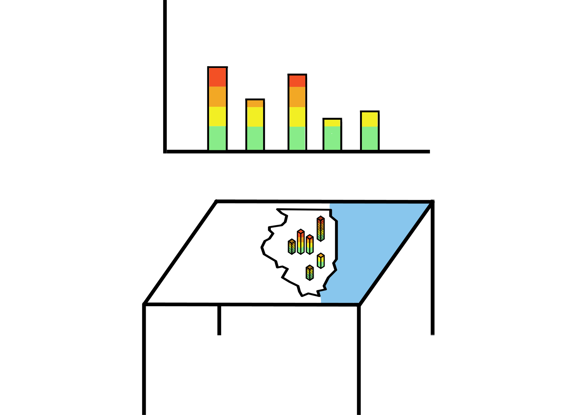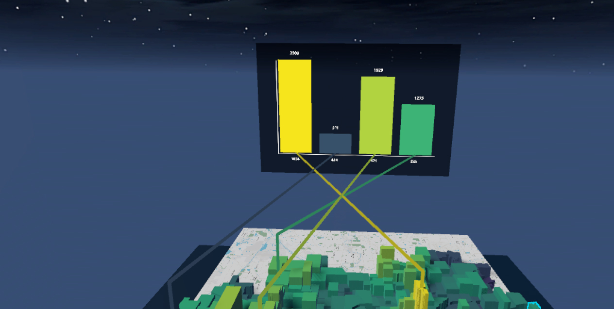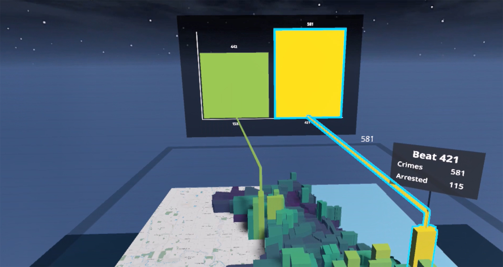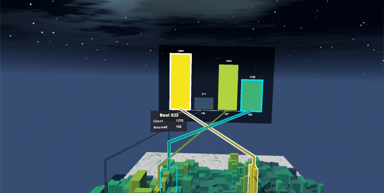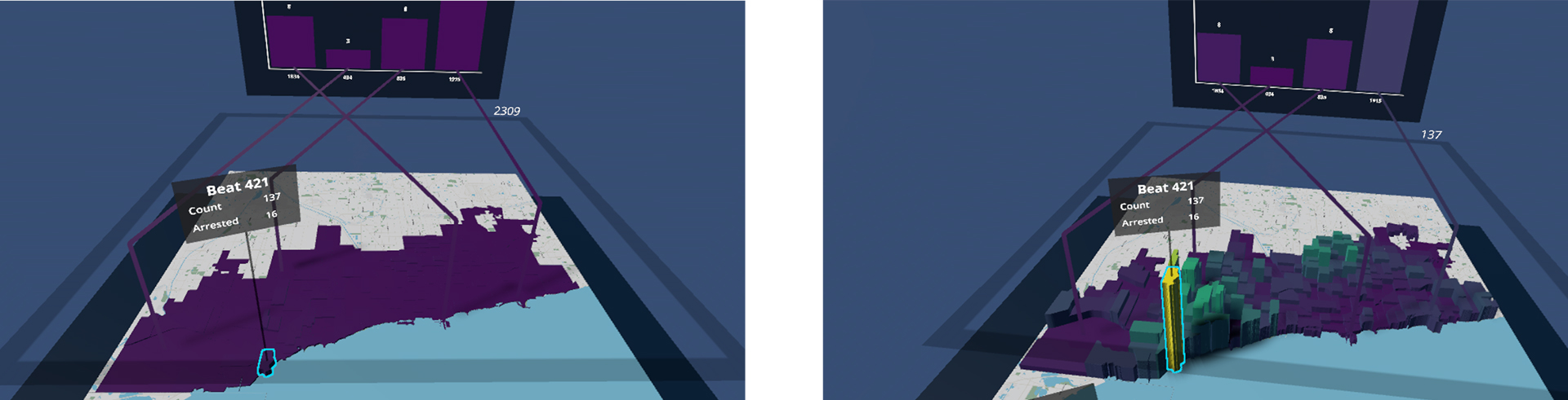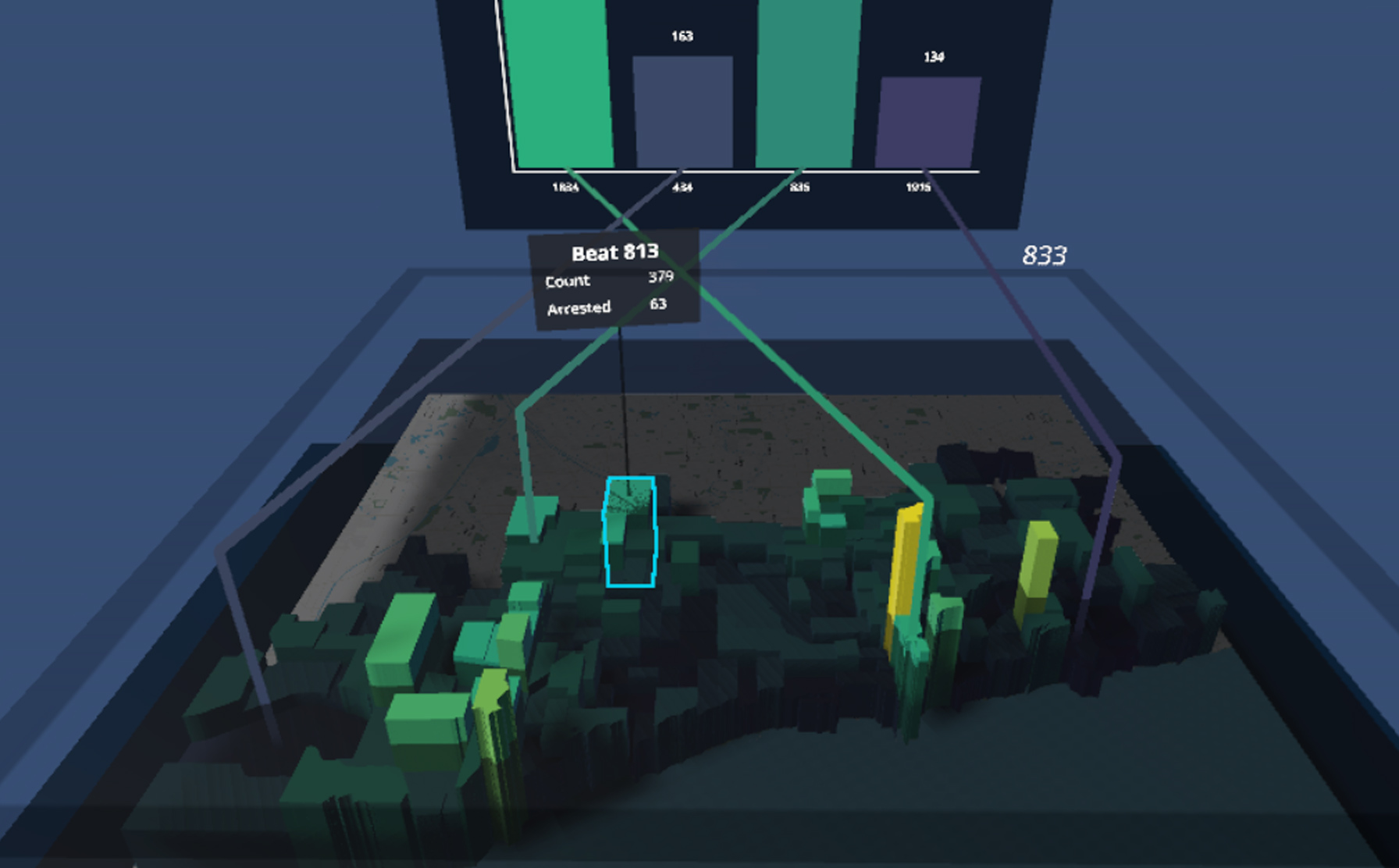In CrimeBlocks, the user stands in front of a table on which a map of Chicago is printed. On the map, 3D blocks in varying heights and colors are placed, giving the impression of a city skyline. These blocks represent so-called beats, the smallest police districts. The height and color of the beats are determined by the number of crimes in the respective beat. Above the table and always in front of the user hovers a 2D bar chart, which allows for a more fine-grained comparison between selected beats. The connection between 2D and 3D visualization is achieved by a line connecting the 3D beat and its 2D counterpart in the bar chart.