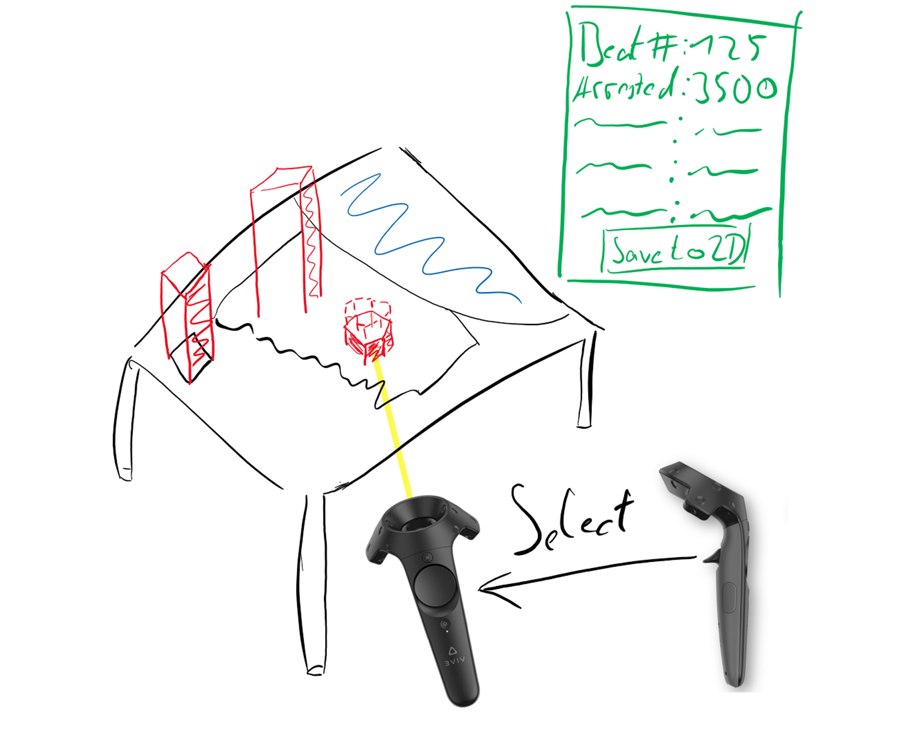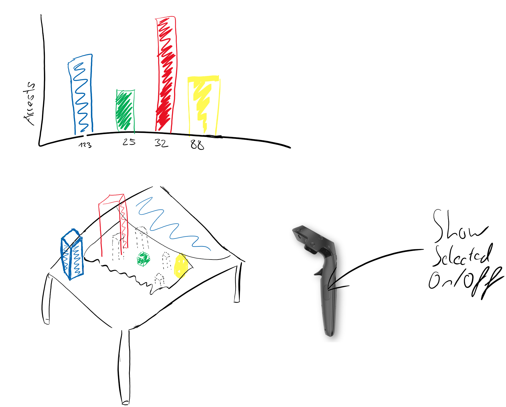 Then, we sketched initial ideas for the interaction with the data. While it was clear to us how we wanted to visualize the data, we were still unsure of how the user should interact with it. We moved back and forth between mapping most functions to the controller and snapping a larger 2D UI to the wrist of the user. Ultimately, we opted for the latter. Below are some of the scribbles created in that phase. We also created some cleaner illustrations to more clearly communicate these ideas in presentations.