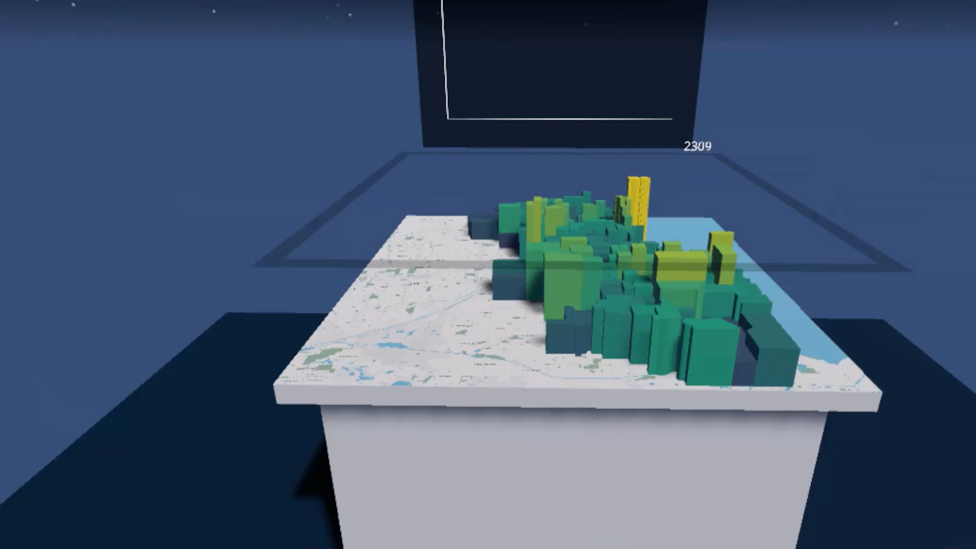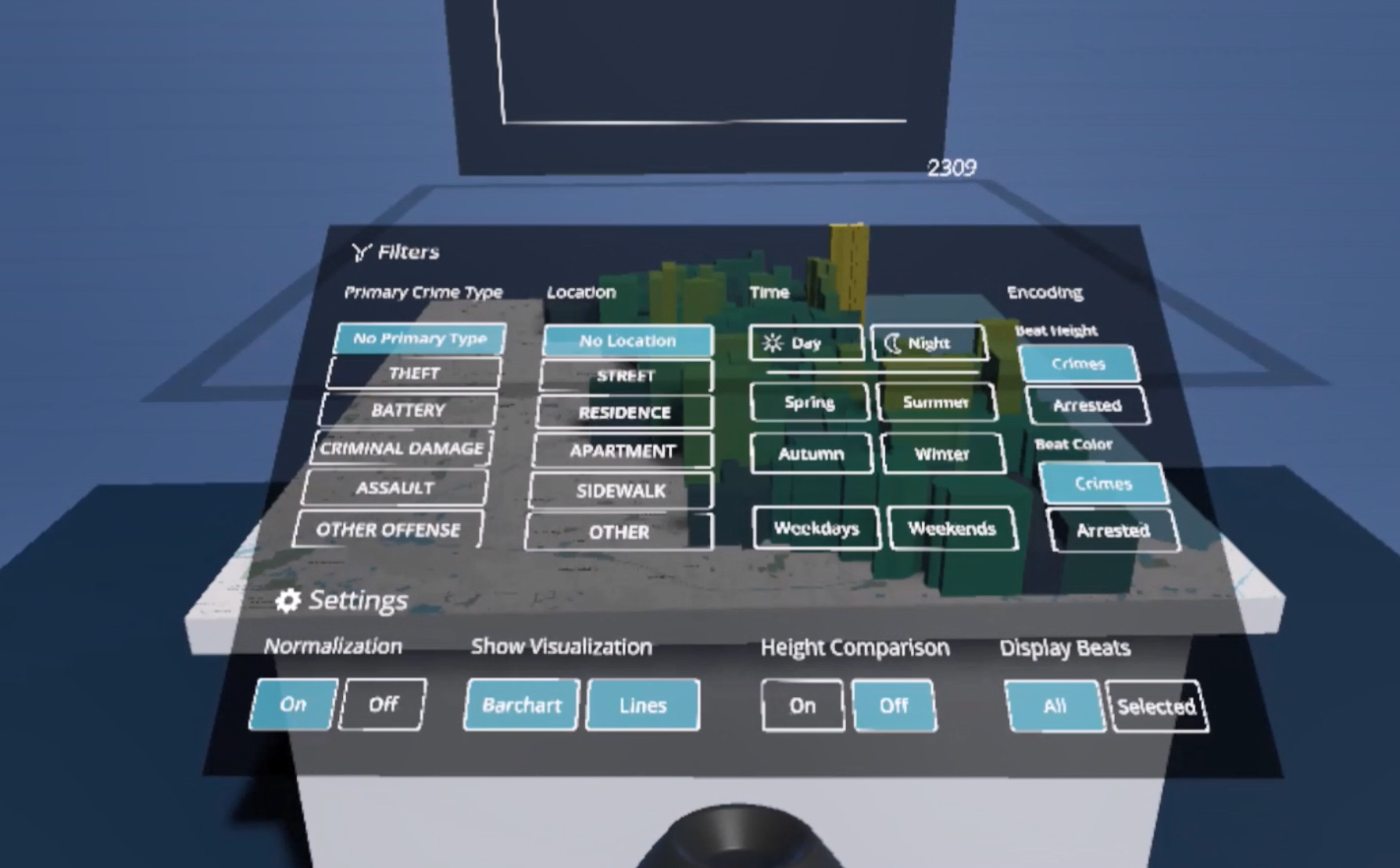 Multiple features, all available from a 2D UI attached to the user’s controller, allow activating or deactivating specific features or manipulating the data in real-time. Regarding the latter, the user can filter between crime types, locations, and times of the crime. Regarding the former, the app can, for example, render a line around the table which shows the maximum value of all shown beats or a slightly opaque plane that that hides all beats below the currently selected one. Further features include only rendering the selected beats or normalizing the data.