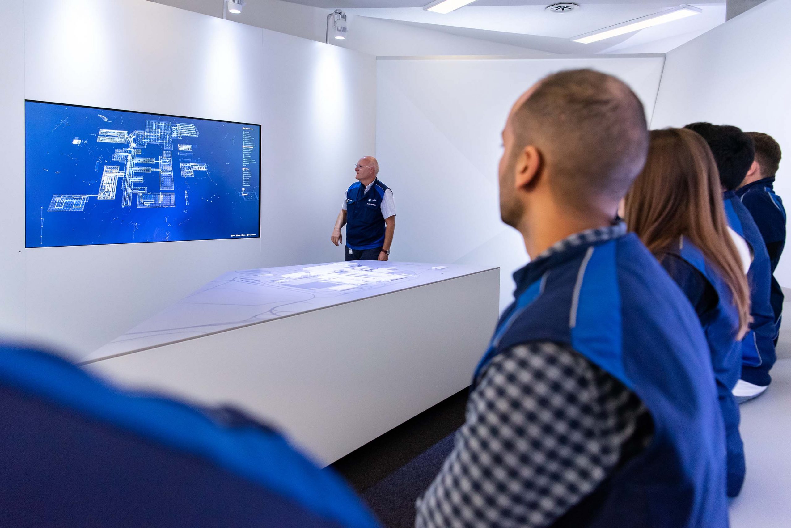 The combination of a miniature model of the factory and an interactive touchscreen creates a tangible, immersive experience. By allowing employees to interact directly with a model of their workplace, they can see in real-time how their specific tasks and locations contribute to the overall production cycle. This physical interaction, coupled with digital feedback on the touchscreen, helps bridge the gap between their day-to-day work and the larger goals of the company.