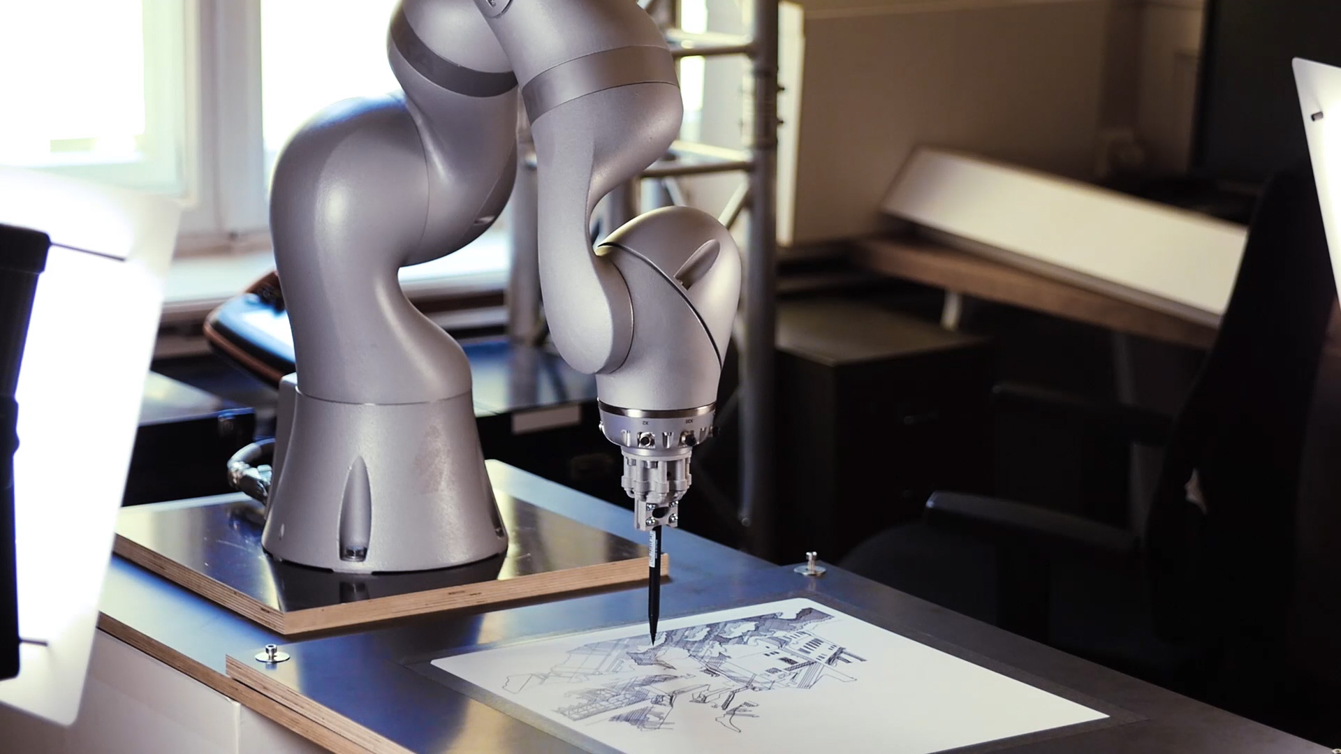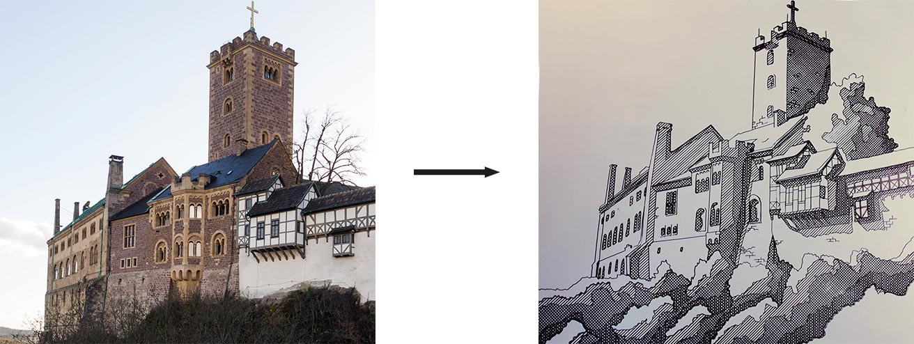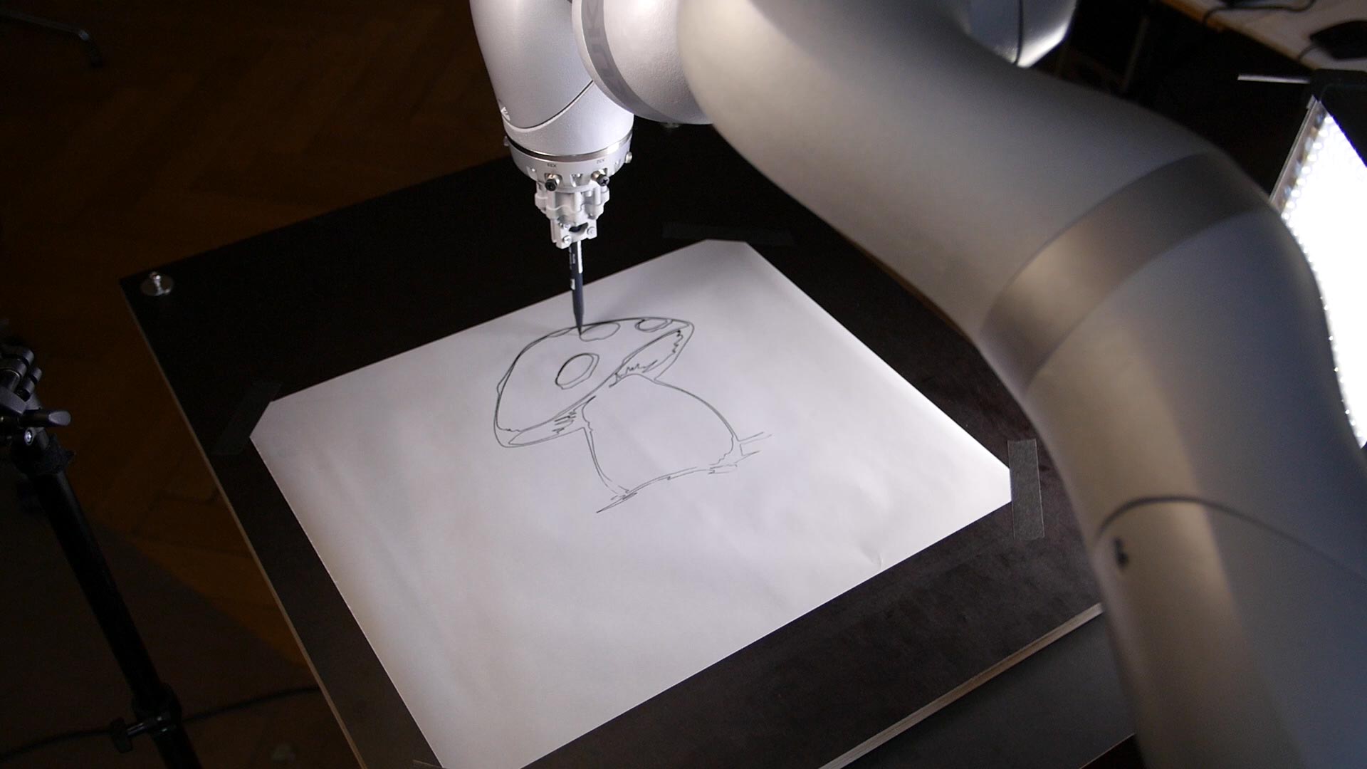 Therefore, we used the robot as a sort of advertisement for an exhibition, where the robot would be used in a different way. For this, I collaborated with an illustrator, who created a drawing of the Wartburg, which the robot then drew.