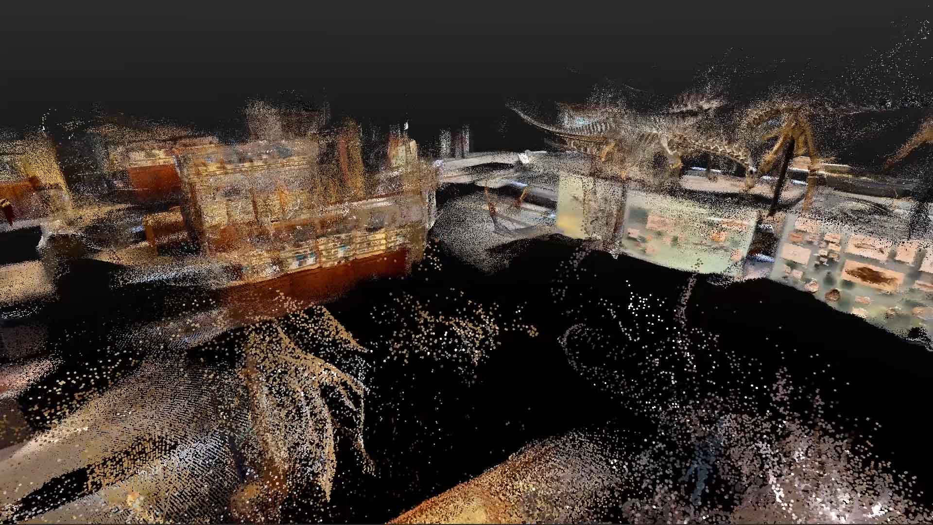 Using a scanned point cloud model of the „dinosaur room“ in the Museum für Naturkunde and some 360 video recordings we had of the same room, I quickly developed a first idea to overcome this: You as a visitor could walk freely through the scanned point cloud.