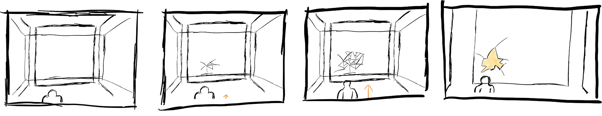 At first, my plan was to pre-render lots of different „glass-shatter“ animations using Cinema 4D and then play these animations randomly if a person would walk towards the glass. However, testing this in a small-scale prototype showed that it felt a bit static and it was not always clear whether the animations just played or whether it was really the visitor who made them break. Because of this, we made the decision to build a fully interactive „glass-shattering“ application.