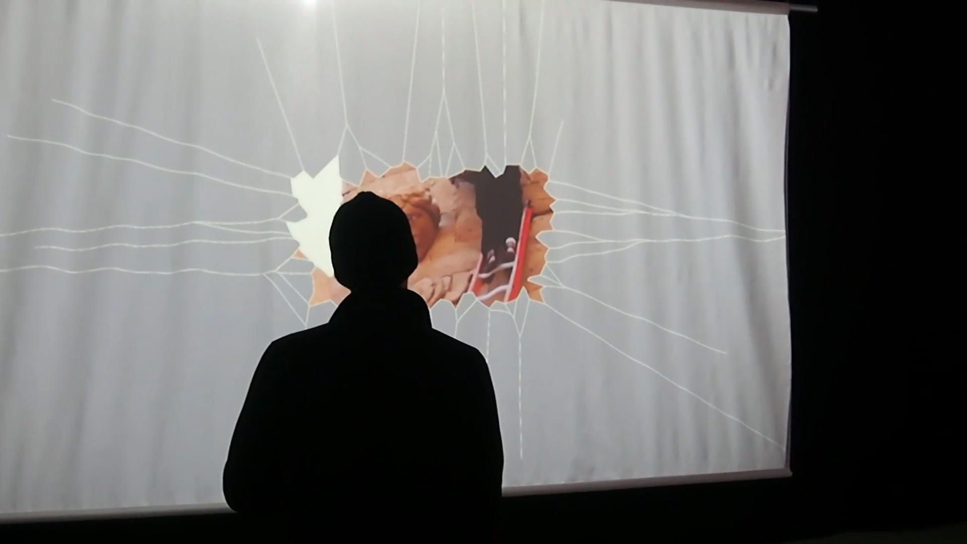 The room-spanning interactive installation „Bruch“ (crack) in the last room of the exhibition „Tell Genderes – 20 Meter Menschheitsgeschichte“ (20 meters of human history) lets visitors experience the destruction of cultural heritage in a subtle way. In the center of the room stands an empty, dimly lit, destroyed showcase. It is a metaphor for the destroyed and lost cultural goods. At some distance from it, gauze fabric hangs from the ceiling, imitating the sides of the showcase. Onto this „fabric showcase“, which is stretched around the actual one, virtual glass is projected. When visitors walk towards the actual showcase, they step „into“ the fabric showcase and unintentionally or intentionally break the virtual glass or break it completely. In the latter case, the resulting peephole displays images and video footage of cultural heritage destruction.